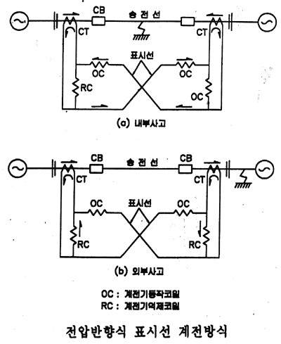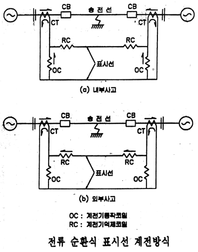 양단의 CT 2차선을 표시선(pilot wire)을 통하여 접속하고 표시선에 직렬로 계전기의 억제 Coil RC를, 병렬로 동작 Coil OC를 접속한다.