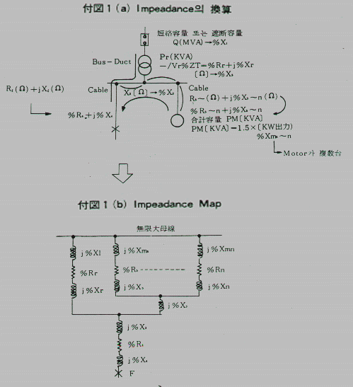 전원, 전동기 등 단락전류 공급원은 임피던스 MAP에서는 동전위이므로 부도1(a)와 같이 무한 대 모선에 이것을 연결, 이것과 고장점 사이에 있는 임피던스의 직렬,병렬을 주의해서임피던스 MAP를 작성한다.