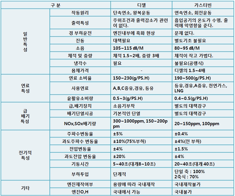 · 부하 특성상 저압발전기 가동방식을 채택하고 장시간 발전기 가동이 예상되는 장소는 디젤 발전기가 종합적으로 유리하다.