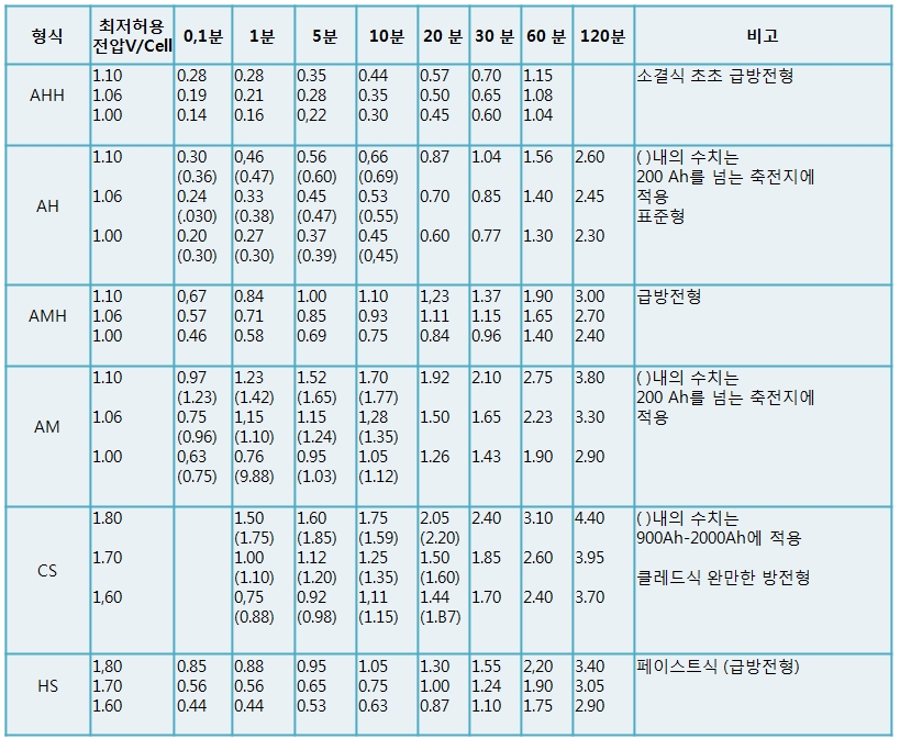 [표] 축전지의 용량환산시간계수(온도 5℃에서)