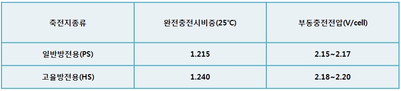 · 부동충전시 과중천으로 인해 축전지 수명이 단축될 수 있고 부족 충전으로 전해액 비중이 저하되어 용량부족현상이 발생하므로 실험결과 아래 표와 같이 규정전압으로 충전한다.