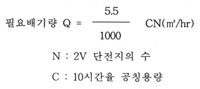 일반적으로 축전지실을 설계할 때에는 다음식을 참고한다. 다만, 시일형 고정축전지는 배기시설이 거의 필요없으며 큐비클에 내장하여 사용하면 별도의 축전지실이 필요없다.