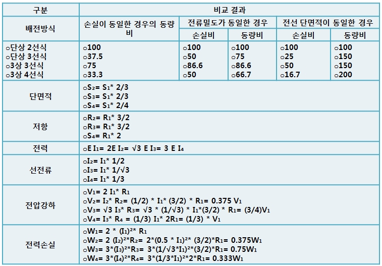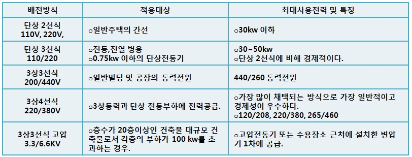 2) 배전방식은 변전설비, 배선, 분전반 등의 규모와 전력손실, 전선의 굵기, 및 허용 전압강하에 따라 각각 다르므로 동일한 부하 조건에서의 배전방식의 결정은 경제성이 좋은 단상3선 또는 3상4선으로 결정하는 것이 좋다.