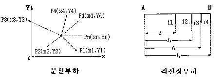 부하의 중심점을 구하려면 먼저 부하를 아래의 그림 a,b로 구분하고 다음식에서 산출한다.