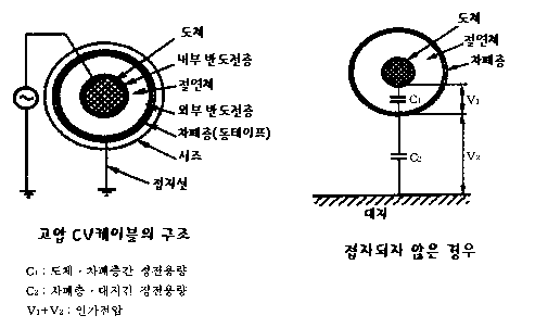 실제 부설상태에서는 통상 C1에 비해 C2가 작기 때문에 차폐층에 발생하는 전압 V2는 인가전압 V에 가까운 값이 된다. 이와같이 접지를 하지 않는 경우에는 파폐층에 매우 높은 전압이 발생하여 위험한 상태가 된다. 또한 접지를 했더라도 접지선의 접속불량 또는 단선이 발생한 경우는 접지하지 않은 것과 동일한 상태가 되어 상당히 위험하다.