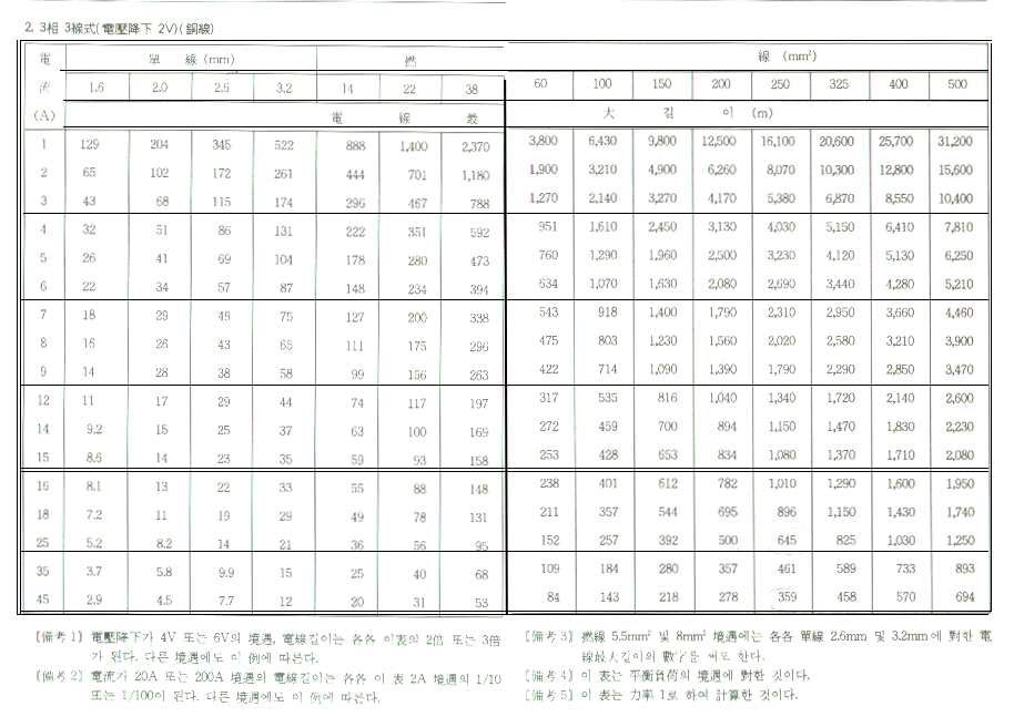 - 1.6㎜(전압강하는 2% 이하가 바람직하다.)