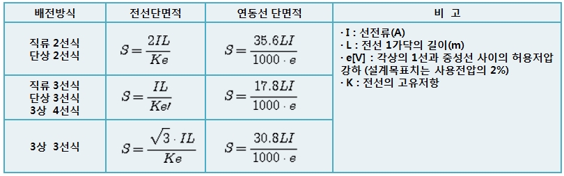 3) 허용 전압강하를 고려한 전선 굵기 산출式에 따라 결정한다.