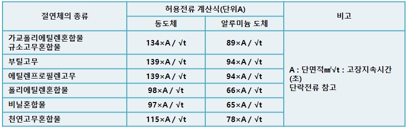 · 케이블의 종류, 심선수, 절연지의 두께 및 최고허용온도