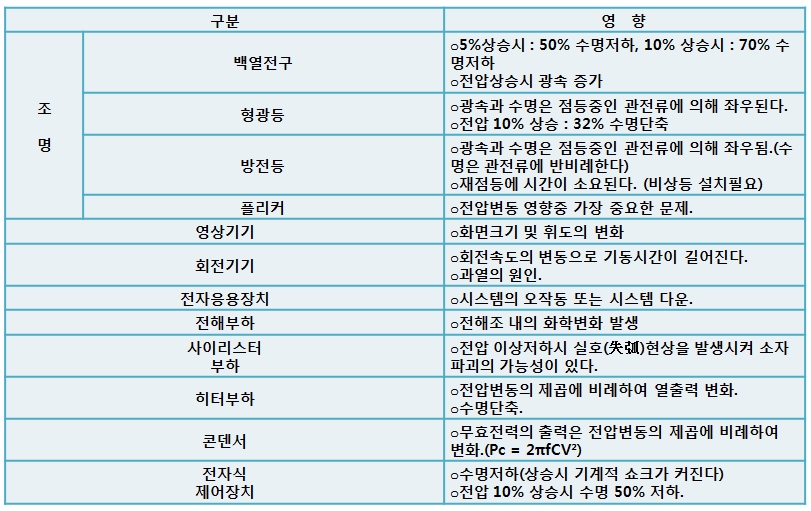 전압강하에 따라 전력손실, 백열등, 형광등의 광속감소 및 깜박임, 유도전동기의 토크감소, 전열기의 발열량 감소등이 발생하여 생산성저하, 효율저하, 기기수명의 단축 등을 초래 한다.