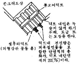 - 덕트에 설치한 전선인출구는 플로어면에서 돌출되지 않고 물이 스며들지 않도록 밀봉하여야 한다.