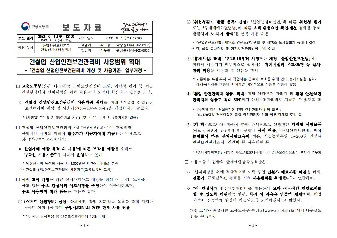 220601 건설업 산업안전보건관리비 사용범위 확대 [고용노동부]