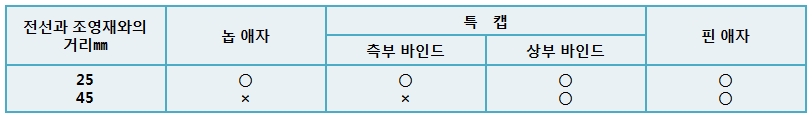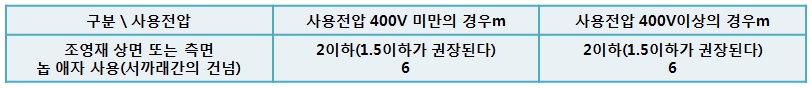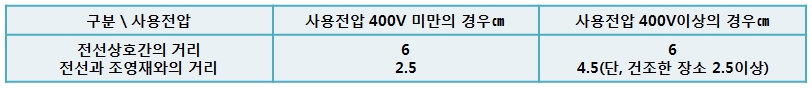 - 전선과 조영재와의 최소이격거리 및 애자의 사용구분은 다음 표에 따른다