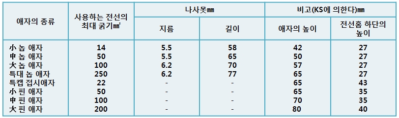 - 애자와 전선 굵기와의 관계는 다음 표에 따른다(배전반 분전반 등의 배선에는 적용하지 않는다)