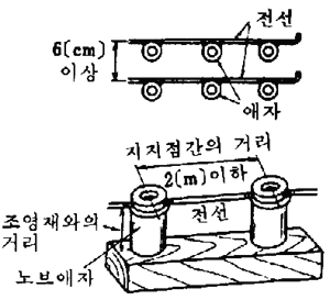 - 전선관과 연결부분에는 관의 양단부(20㎝ 단 가옥의 외벽을 관통할 경우에는 60㎝ 이내)에는 애자를 설치하여 전선을 지지할 것.