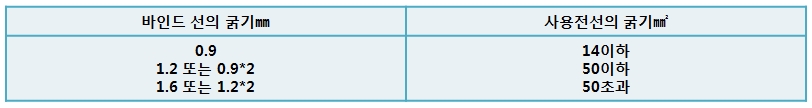 - 바인드선과 전선굵기의 관계는 다음 표에 의할 것(전선에 동선을 사용하는 경우)