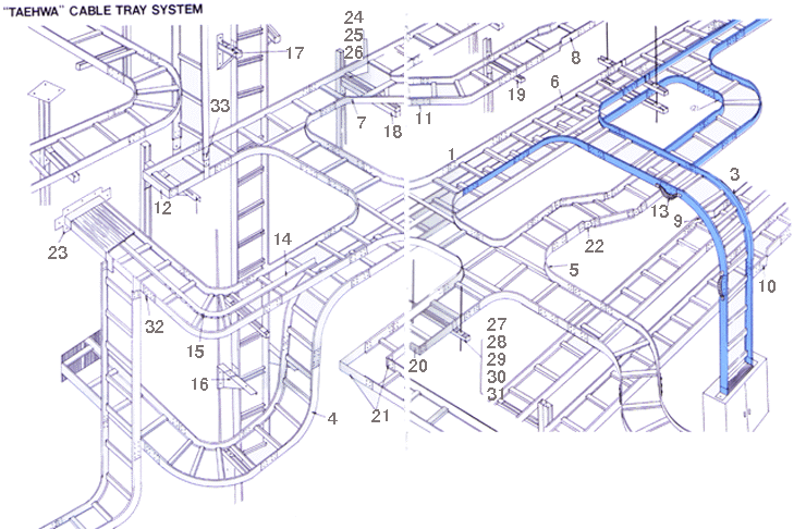Cable Tray System이란 금속 케이블 트레이 단면도와 기타 부대자료를 하나로 모아서 케이블을 버팀하는 구조물을 만드는 시스템을 말한다.
