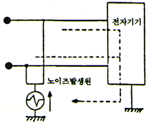 · 따라서 주파수가 수십(K㎐) 이상의 노이즈에 대해서는 전원주파수의 경우보다 수천분의 일 이하로 줄어들 게 되므로 이를 무시할 수 없게 되어 기기와 대지간의 분포용량 리액턴스에 의해 노이즈에 대한 폐회로가 구성되며 그 분포용량은 노이즈의 통로가 된다.