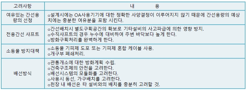 정보용 배관은 현재의 정보통신 시스템을 만족시킬 뿐만 아니라 장래 시스템의 확장에 대해서도 최대한의 대응을 할 수 있도록 고려할 필요가 있다. 특히 공사 완료후 증설공사로 인하여 빌딩 골조를 변경한다는 것은 불가능하기 때문에 시공 계획시 다음에 유의 하여야 한다.