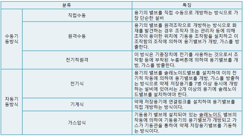 기동방식은 수동기동방식과 자동기동방식(자동화재탐지설비와 연동하여 자동적으로 가스를 방출하는 방식으로서 화재감지, 화재경보,환기장치의 정지, 방화문폐쇄 등 일련의 동작을 자동으로 이루어지게 한 후 용기의 밸브를 개방, 가스를 방출한다.)으로 분류하며 그 특징은 표와 같다.