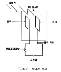 자외선 센서는 그림3 Vdc350 정도의 전압을 전극에 인가받고 자외선의 입사에 의해 음극에서 방출된 광전자를 방전현상에 의해 기체상태로 배증하는 냉 음극관으로 구성된다