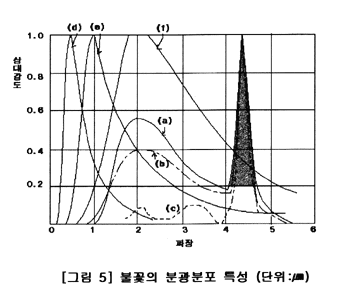 · (d)는 태양광 6000°k, (e)는 백열전구 2850°k , (f)는 2 ㎛ 부근에서 최대값을 갖는 1400°k의 고온 물체들의 분광분포 특성으로 Flank 법칙에 의해 구한 것이다.