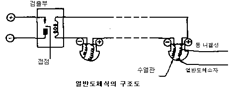 · 감열부에 열전대를 사용한 것으로 감지구역마다 여러 개의 열전대를 접속전선을 통하여 직렬로 접속하여 화재시의 온도상승에 의하여 각 열전대에서 흐르는 열전류를 검출기에서 검지하여 화재를 감지하는 방식이다.