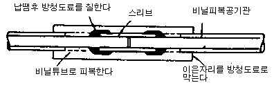 · 슬리브조인트는 그림과 같이 조인트 부분을 비닐튜브로 피복하고 그 이은 자리에는 반드시 방식처리(도료)를 할 것.