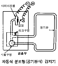공기관과 다이아프램, 리크구멍 및 접점으로 구성되며, 천장면에 펼쳐진 공기관이 화재에 의하여 열을 받으면 공기관 내의 공기가 팽창하여 검출기의 리크구멍에서 누설되지 않은 팽창한 공기가 다이아프램을 팽창시켜 접점이 접촉되어 경보를 발한다.