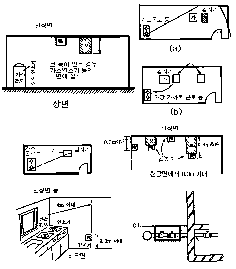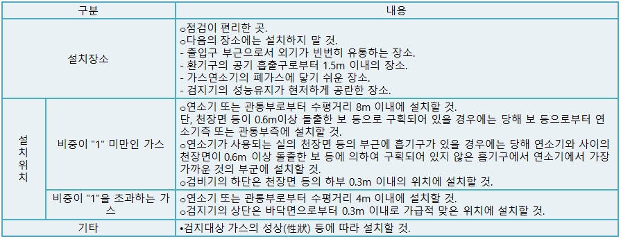 · 누설가스가 공기보다 무거운 것은 아래쪽에, 공기보다 가벼운 것은 위쪽에 탐지부를 설치한다.