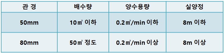 - 관경은 배수량, 펌프, 양수용량, 전 양정에서 다음을 표준으로 한다.