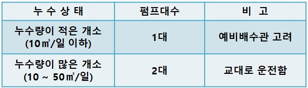 ○ 배수방법은 펌프의 일반배수를 표준으로 하고 펌프대수는 아래 기준에 따라 결정한다.