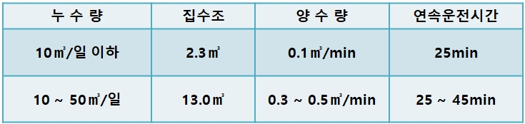 ○ 배수펌프의 양수량과 연속 운전시간은 집수조 용량 및 누수량에 의해 다음을 표준으로 한다.