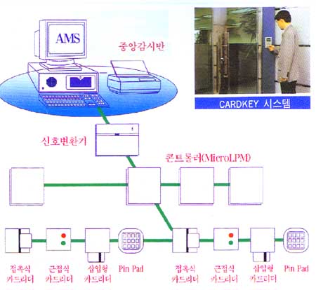 이러한 ID CARD 시스템의 주요 구성은 CARD READER, DOOR LOCK, 방범용 침입 감시센서와 이들을 통합하는 DPC및 통합관리 제어하는 HOST로 구성되어야 한다.