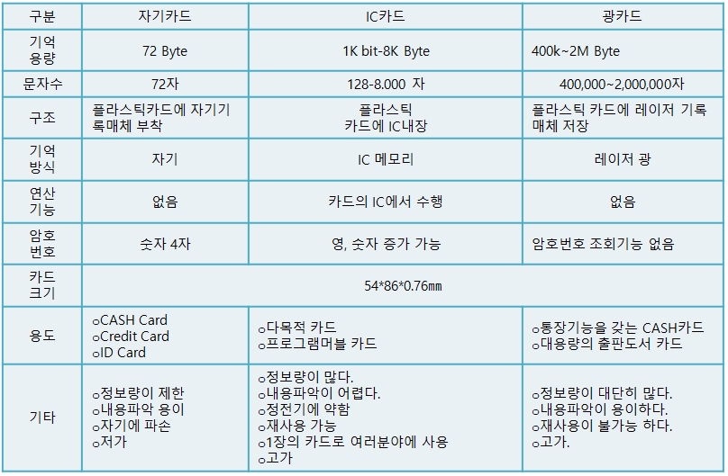 < 자기카드와 IC카드, 광카드의 비교 >