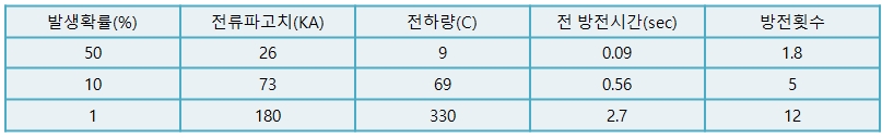 뇌 방전은 각종 전류의 조합으로 구성되고 그 크기는 시간과 더불어 변화한다. 많은 관측결과를 집약해 보면 뇌 방전의 발생확률에 의거 다음 표와 같이 요약된다.