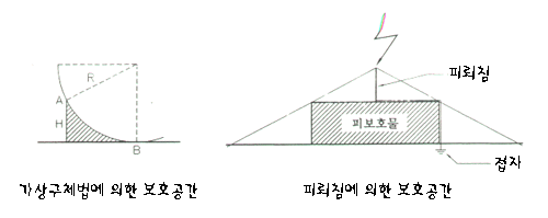 이 가상 구체법에 의거하여 그림의 사선부분이 보호공간으로 결정되고, 이 공간은 직격뢰를 받지 않는다. 더욱, 이 가상구체가 보호장치(피뢰침, 메시, 케이지 등)에 접촉하고 전체 보호물에 접촉하지 않으면 이보호장치는 뇌격에 대하여 유효한 것이다. 반대로 접촉할 경우에는 전체 보호물체에 가상구체가 접촉하지 않도록 보호장치를 변경하여 설치하여야 한다.