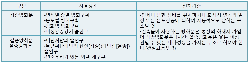 - 사용장소별 방화문 설치기준