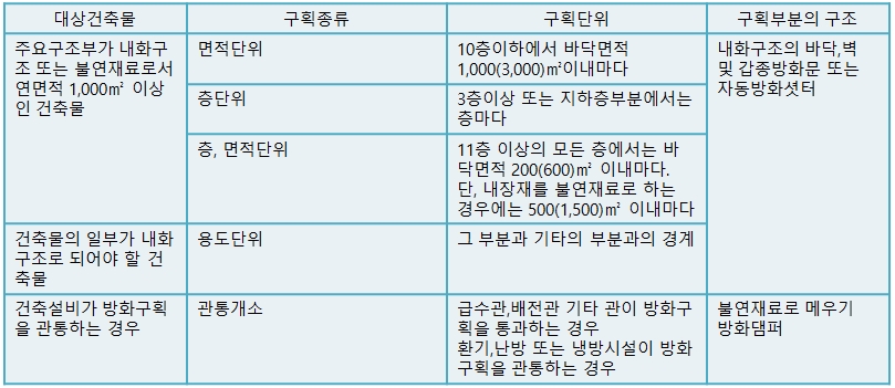 건축물을 일정면적 단위별, 層별,용도별 또는 구조별 등으로 구획함으로써 화재시 일정범위 이외로의 연소를 방지하여 피해를 국부적으로 한정시키기 위한 것으로 건축法의 방화에 관한 규정 중 가장 중요하다.