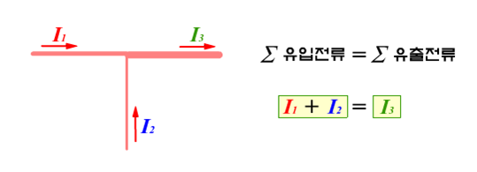 임의의 회로에서 접속점에 흘러들어오는 전류의 합은 흘러나가는 전류의 합과 같다.즉,