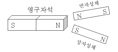㉡ 반자성체 : 강자성체와 반대 극성으로 자화되는 물체로 자성체와 자석이 같은 방향으로 자화 된다.(금, 은, 구리, 아연 등)