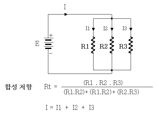 ※ 병렬회로에 연결된 각각의 저항에 걸리는 전압은 공급 전압(E)로 모두 같으며, 각각의 저항에 흐르는 전류의 합은 전체의 전류 I 와 같다.