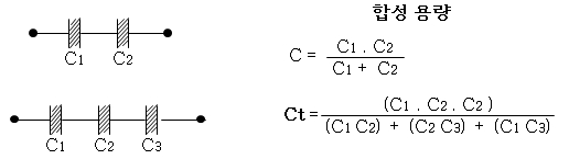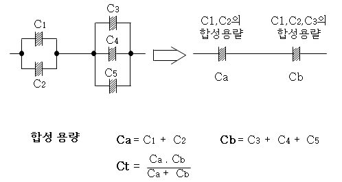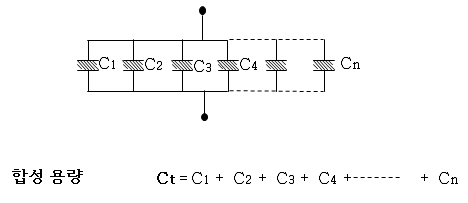 ※ 용량이 월등히 큰 콘덴서와 적은 콘덴서를 병렬연결 시에는 용량이 적은 콘덴서는 무시한다.