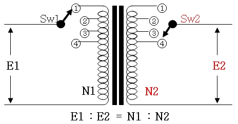 위 그림의 Sw2를 1을 ④에서 ③②①방향으로 전환 할수록 2차(N2) 코일에는 변화하는 자력선을 보다 많이 유도 받게 된다. 따라서 출력전압(E2)이 높아지게 되고, Sw1을 ①에서 ②③④로 전환 할수록 1차(N1)코일의 역기전압이 적어져 저항이 적게 작용해 코일에 많은 전류가 흘러 2차(N2)측 코일에는 자력선이 많이 유도되어 같은 원리로 출력전압(E2)이 높아진다.