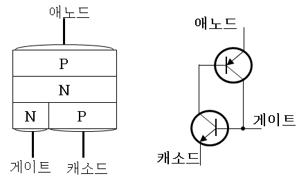 ① PNPN Diode에 게이트 전극을 붙인 것으로 애노드나 캐소드에 순방향 전압이 걸리고 게이트에 신호를 가하면 애노드, 캐소드가 도통 되며 전류가 흐른다.
