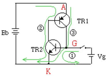 그림(Fig03)과 같이 순간적으로 G-K간에 순방향전압 Vg를 공급하면 A-K간의 전류가 흐른다.