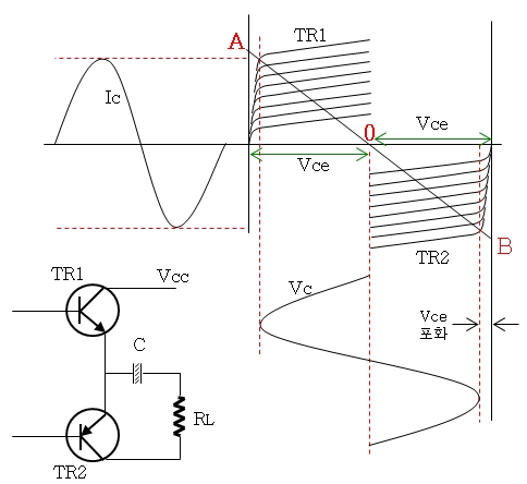 TR1의 동작번위는 A점에서 0점까지이고, TR2의 동작범위는 B점에서 0점까지가 된다. 여기서 최대출력전압 (Vc max)과 최대출력전류(Ic max)를 구하면,