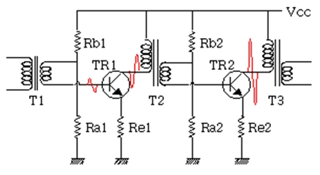 그림(Fig02)의 트랜스결합 증폭회로는 RC결합 증폭회로에서 Rc1과 C2 대신 트랜스를 삽입하여 결합한 증폭회로다. 트랜스는 출력 임피던스와 다음 단의 입력 임피던스를 매칭시키는데 사용된다. 에미터접지 증폭기의 경우 입력 임피던스는 수100[Ω]정도로 낮은데 비하여 출력 임피던스는 수[kΩ]정도가 되는데 트랜스를 사용하여 매칭시킨다.