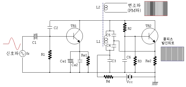 그림(Fig03)은 간단한 직접 주파수 변조를 한 예를 보인 것이다. 이 원리를 응용한 것으로는 FM 무선마이크로폰(wireless microphone) 등이 있다. 주파수 변조에서도 진폭변조와 마찬가지로 측파대(Side band)가 발생한다.
