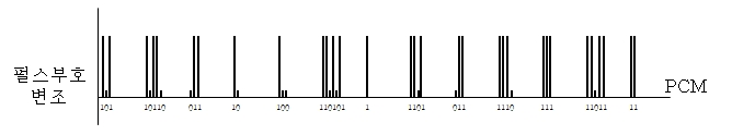 신호 레벨에 따라 그림(Fig07)과 같이 펄스열의 유무를 변화 시킨다. 신호 레벨을 수 비트(bit)에서 16비트 정도까지의 2진 부호에 대응시킨다. 즉 각 표본화별로 그 신호레벨을 일정 비트를 가지는 2진 부호로 바꾸어 부호화한다.