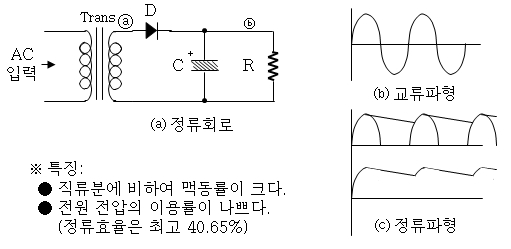 정류하고자 하는 전압이 단상 교류로서 ⓐ의 파형이 그림 5-1 ⒝과 같은 파형이 입력될 때 정류기(D)의 애노드측이 '+'반주기 때만 정류기가 동작하여 부하에 정류 전류가 흘러 C에 충전된다. 그리고 Θ반파가 입력될 때는 정류기가 동작하지 않는다.